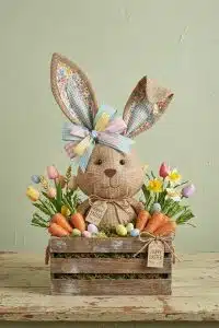 Set a rustic 'Hoppy Easter' wood sign and a small ceramic bunny figurine on a burlap runner to finish the base.