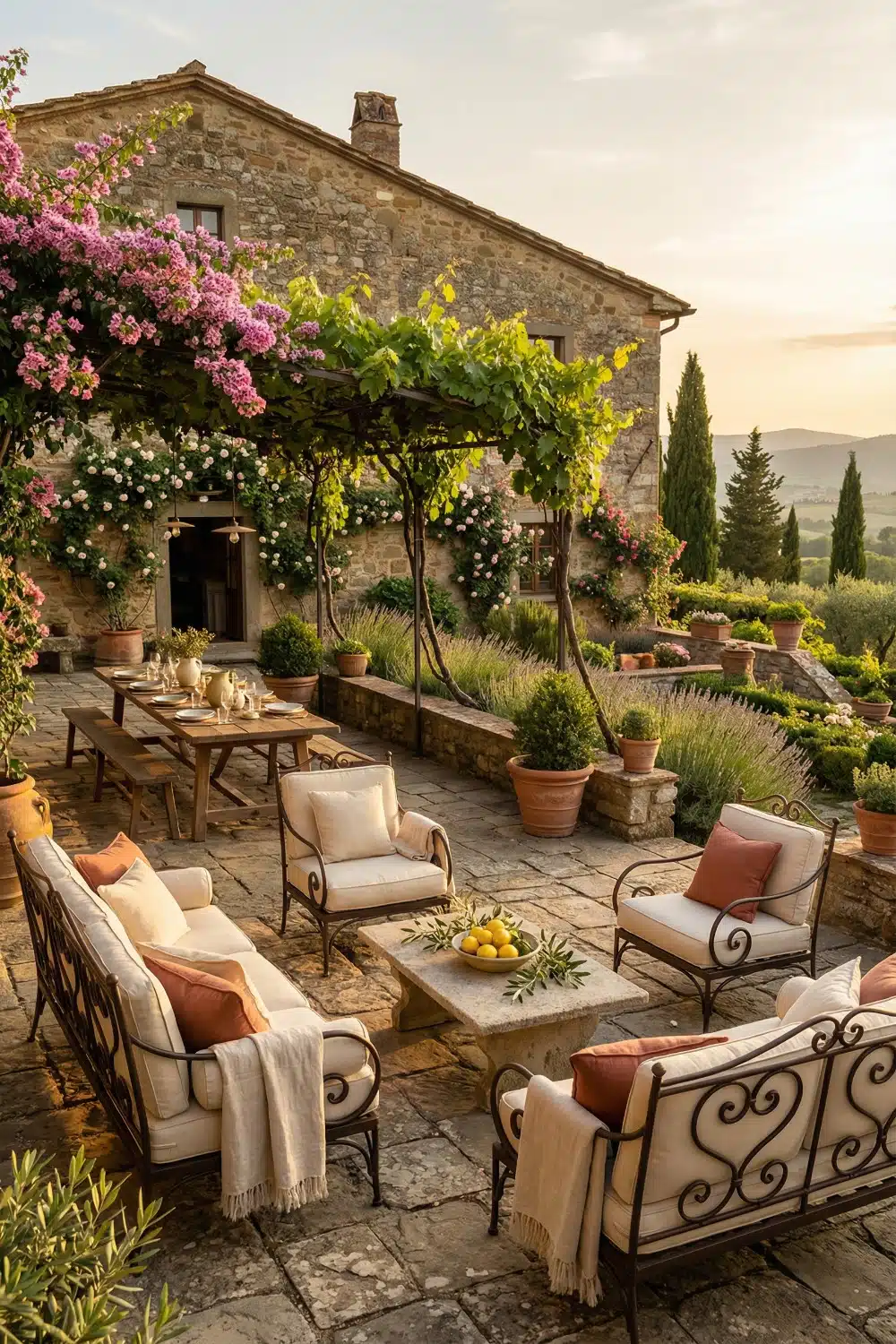 💡 Pro Tip: Brush your new terracotta pots with a mixture of buttermilk and moss to grow a green crust in weeks. It makes cheap store pots look like they sat in a garden for decades. Secure the yard with flagstone to stop mud from ruining your gorgeous cream cushions.