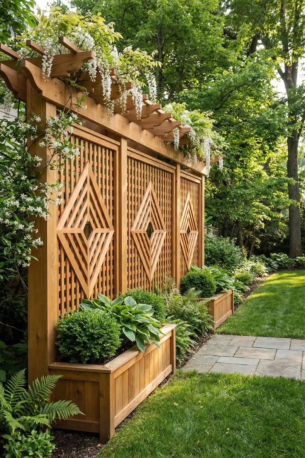 Fill these with hostas and boxwood because their dense foliage adds another layer of privacy trellis ideas at eye level.